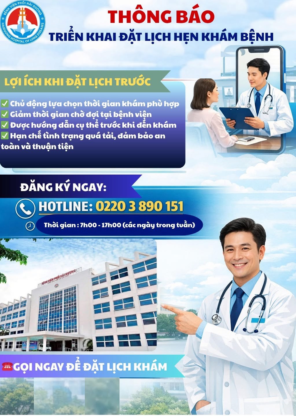 Nhằm nâng cao chất lượng phục vụ và giúp người bệnh tiết kiệm thời gian chờ đợi, Bệnh viện Phổi Hải Dương chính thức triển khai dịch vụ đặt lịch hẹn khám bệnh qua hotline.