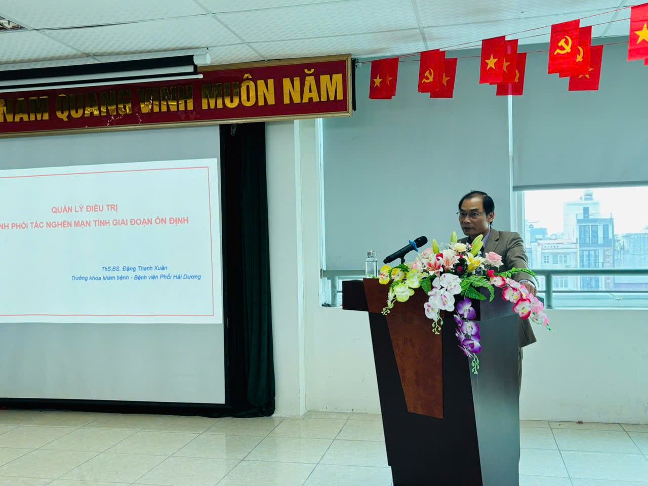 Ths.Bs Đặng Thanh Xuân – Trưởng khoa Khám bệnh trình bày tại Hội thảo chuyên đề “Cập nhật quản lý điều trị bệnh phổi tắc nghẽn mạn tính (COPD) giai đoạn ổn định”. COPD là một trong những nguyên nhân hàng đầu gây tử vong và gánh nặng bệnh tật trên toàn cầu. Nội dung bài trình bày nhấn mạnh tầm quan trọng của việc chẩn đoán sớm, điều trị đúng phác đồ và quản lý bệnh nhân COPD giai đoạn ổn định nhằm giảm triệu chứng, phòng ngừa đợt cấp, làm chậm tiến triển bệnh và cải thiện chất lượng cuộc sống cho người bệnh. Bên cạnh điều trị dùng thuốc, các biện pháp không dùng thuốc như cai thuốc lá, tiêm phòng, phục hồi chức năng hô hấp và giáo dục bệnh nhân cũng được nhấn mạnh trong chiến lược quản lý toàn diện COPD.