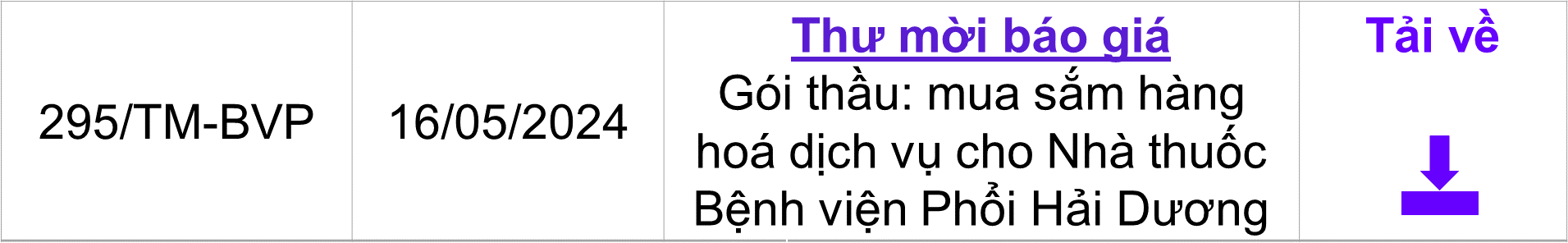 - Bệnh viện Phổi Hải Dương có kế hoạch thực hiện mua sắm các loại thuốc, vật tư y tế, thiết bị y tế, các loại thực phẩm, hàng hoá cho Nhà thuốc Bệnh viện.